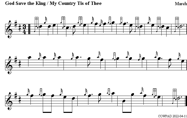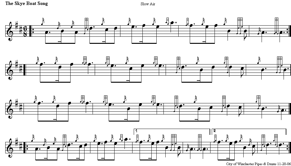 Where shown below, the band setting for our music is done in Bagpipe Music Writer Gold (BWW). It can be opened, played and printed with that program, or with the free Bagpipe Player or with the full or demo version of Electric Pipes. Or you can print the Image files for your own copy of the music.